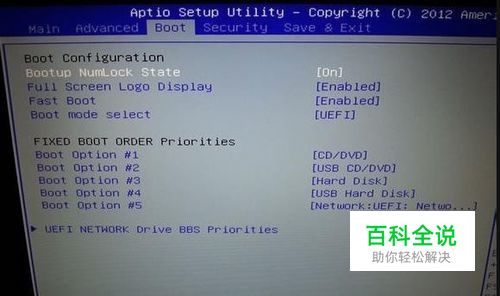 2、在bios设置界面,移动键盘上的左右方向键切换到“Boot”选项卡下
