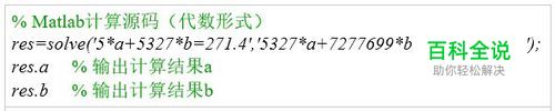 Matlab计算源码(代数形式) res=solve('5*a+5327*b=271.4','5327*a+7277699*b=369320','a','b'); res.a % 输出计算结果a res.b % 输出计算结果b