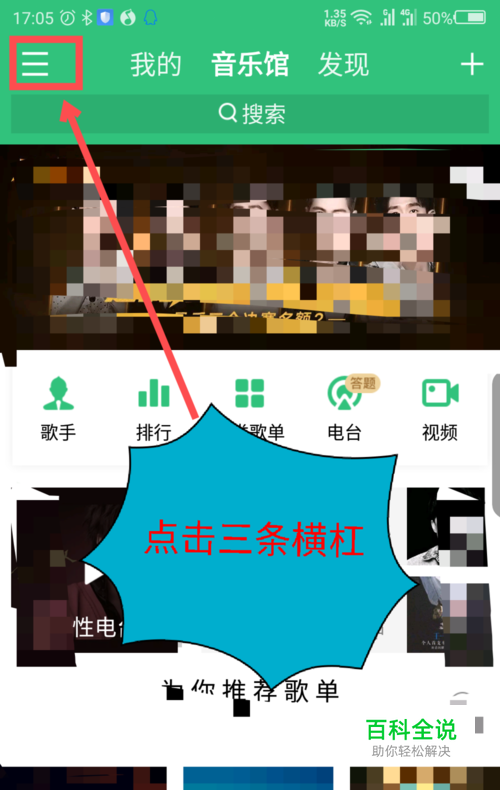 打开QQ音乐软件,在首页点击左上角的三条横杠图标。