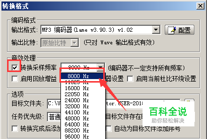 在“音频处理”中,可以将“转换采样频率”适量调小。