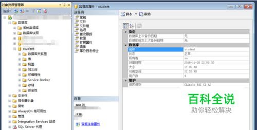 第一步,选中数据库student,鼠标右键点击“属性”,打开数据库属性设置窗口,查看数据库属性,如下图所示: