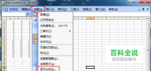 这里我介绍两种方法来解决这个问题。第一种方法就是使用Excel本身的显示比例功能来放大显示。如图,单击视图菜单,选择显示比例。