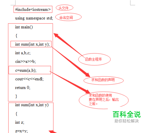 程序代码(一个求和函数): #include<iostream> using namespace std; int main() { int sum(int x,int y); int a,b,c; cin>>a>>b; c=sum(a,b); cout<<c<<endl; return 0; } int sum(int x,int y) { int z; z=x+y; return (z); } 各部分的简介注意事项如图: