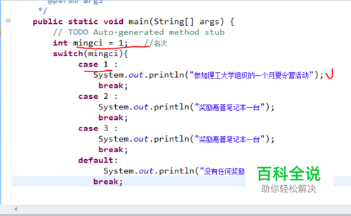 public calss Compete{ public static void main( String [] args){ int mingci = 1; //名次 switch(mingci){ case 1 : System.out.println("参加理工大学组织的一个月夏令营活动"); break; case 2: System.out.println("奖励惠普笔记本一台"); break; case 3: System.out.println("奖励惠普笔记本一台"); break; default: System.out.println("没有任何奖励"); break; } } } 以上代码就实现了switch选择结构:运行结果如下图: