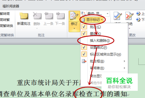 接下来,设置我们修订的显示。 如图,点击【显示标记】,选择需要显示的修订标记。图中,我们不勾选【插入和删除】,与上一步骤的配图相比,就看不到删除“核查”输入“检查”的修改痕迹了!
