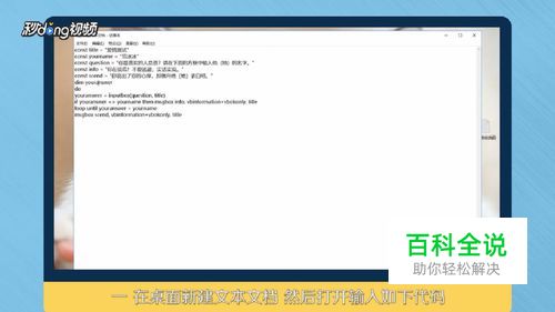 首先在桌面新建文本文档,然后打开输入代码: const title = "爱情测试" const yourname = "范冰冰" const question = "你最喜欢的人是谁?请在下面的方框中输入他(她)的名字。" const info = "你在说谎!不要逃避,实话实说。" const scend = "你说出了你的心扉,那就向他(她)表白吧。" dim youranswer do youranswer = inputbox(question, title) if youranswer <> yourname then msgbox info, vbinformation+vbokonly, title loop until youranswer = yourname msgbox scend, vbinformation+vbokonly, title
