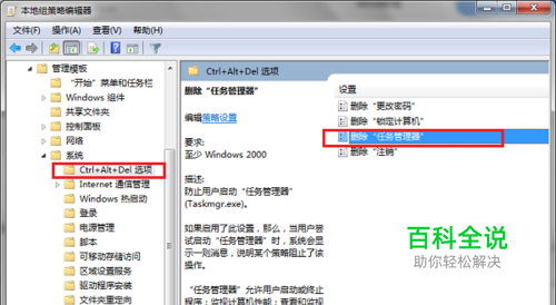 第二步点击确定之后,进去本地组策略编辑器,点击“用户配置->管理模板->系统->CTRL+ALT+DELE”,在右侧选择“删除任务管理器”,如下图所示: