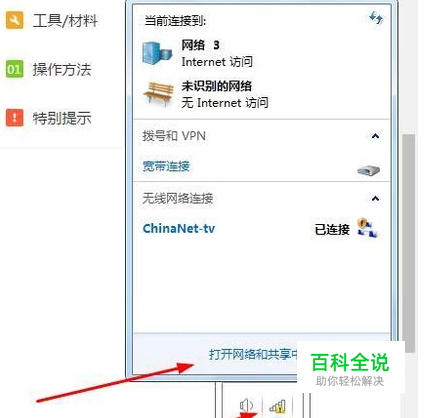 首先打开“打开网络和网络共享中心”如下图。