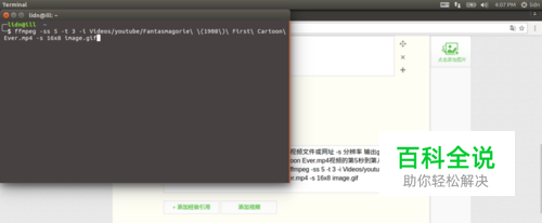 然后输入ffmpeg -ss 起始时间 -t 持续时间 -i 视频文件或网址 -s 分辨率 输出gif文件,例如将Fantasmagorie (1908) First Cartoon Ever.mp4视频的第5秒到第八秒转换成分辨率为16x8的gif图片可在终端输入ffmpeg -ss 5 -t 3 -i Videos/youtube/Fantasmagorie\ \(1908\)\ First\ Cartoon\ Ever.mp4 -s 16x8 image.gif,然后回车即可。