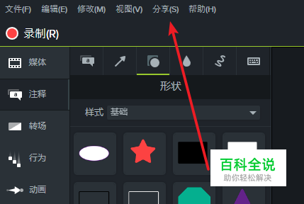 在编辑完或者录制完视频后,首先点击菜单栏上的“分享"。