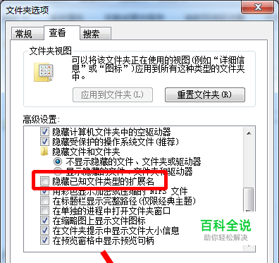 点击文件夹选项----查看--- 隐藏已知文件类型的后缀名(前面的勾去掉)