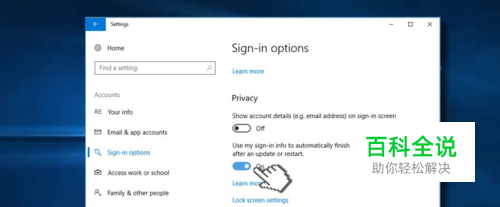 按Windows键+ I并导航到更新和安全。 打开Windows Update部分并单击高级选项。 禁用使用我的登录信息 设置来解决问题。 然后打开设置的主窗口并选择帐户。 打开登录选项并点击左侧窗格中的隐私。 关闭使用我的登录信息在更新或重新启动 设置后自动完成设备设置。 最后,重新启动系统。