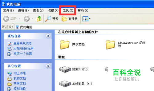 我们随便在一个文件夹的界面或者是磁盘的界面都可以搞定,那么我们假定打开了我的电脑,在上面一排菜单选项中有一个选项叫做工具,我们点击一下。