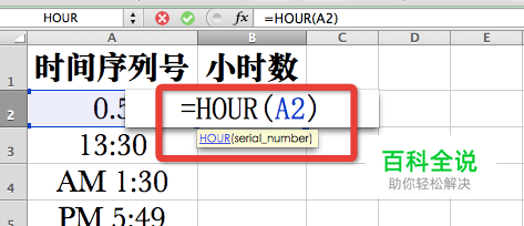 在B2单元格输入HOUR函数,serial_number参数引用A2单元格。