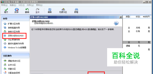 然后打开主页面,在左侧向导工具栏内,点击,迁移系统到固态硬盘。在弹出的对话框中点击下一步。