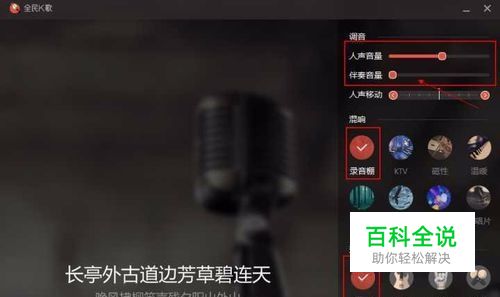 打开唱吧K歌(注意:是电脑版)录制一首歌曲,录完之后要按以下步骤操作: 1、把伴奏音量调为0(后期我们只需要处理人声,所以伴奏音量一定要关掉) 2、混响选择录音棚 3、变声选择原声 4、点击保存即可