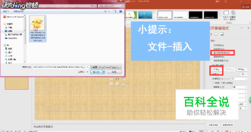 在右侧弹出的菜单栏中,选择“图片或纹理填充”,点击“文件”按钮,在电脑中找到想要插入的图片文件,选择后点击“插入”,此时背景图片插入成功。