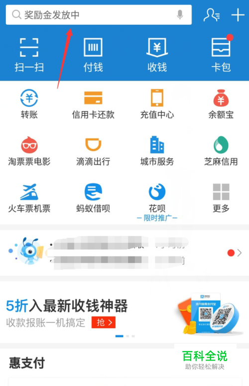 首先我们先打开支付宝手机客户端,打开之后单击面板顶部的搜索框。