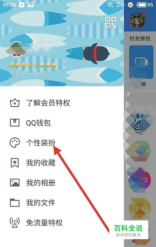 在弹出来的左侧个人页面中,点击“个性装扮”,如下图所示: