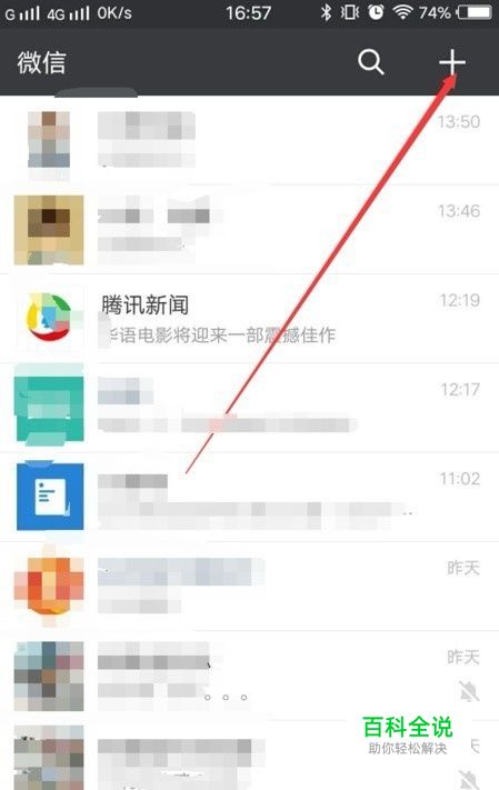打开微信。选择右上角的加号。