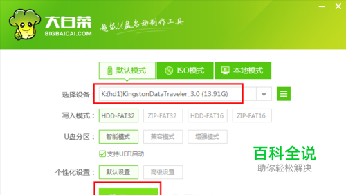 首先下载并安装大白菜U盘启动盘制作工具 并运行 如图所示 选择制作的U盘盘符 点击制作