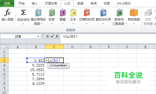 当num是单元格时的操作:在一个空白的单元格中输入“=ln(num)”,本例中num是B3,点击确定即可。