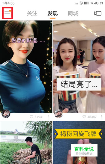 打开手机中的快手,在快手的推荐界面中点击左上角的【三】按钮。