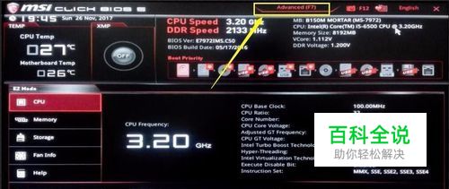 按下开机键之后,不断按DEL键进入微星UEFI BIOS。按下F7或点击上方的Advanced(高级)按钮,进入高级模式。