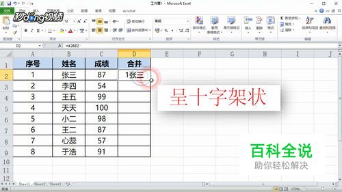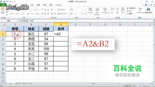 方法一:我们先制作好样表,我们现在要把序号和姓名列的内容合并到一个表格。我们选中合并列对应的单元格,然后输入公式:=A2&B2,按回车键结束。