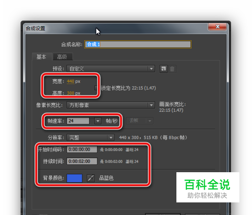 打开AE软件,按Ctrl+N,新建一个合成,大小为440*300即可,背景色可以设定成品蓝色,其他参数如图设置,然后点击确定即可。