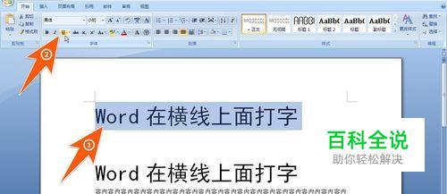 word要实现在横线上打字有几种操作方法,先看第一种,首先把要出现在横上的字选中,然后点击左上方的那个U下面有横线的图标。