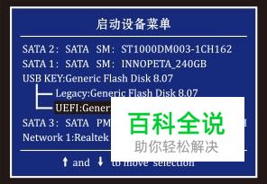 选择启动设备菜单 通过热键进入后,会出现类似下图的界面。 1、优先选择"UEFI"字母开头的选项。 2、如果没有"UEFI"选项,则选择"Legacy"字母开头的选项。 3、如果以上两个选项都没,则选择"USB HDD",字母开头的选项。