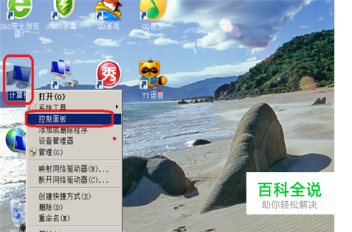 1、在桌面上找到我的电脑或计算机图标,鼠标指向图标,单击右键,找到控制面板,单击一下。