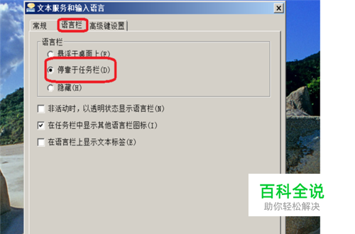 4、单击语言栏,把隐藏前圆内的对号去掉,在停靠于任务栏前的圆圈内,单击一下,再单击确定,输入法就出现了。
