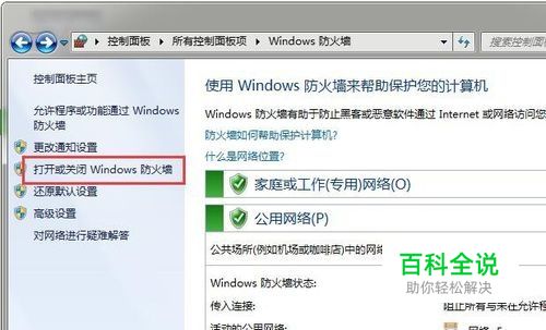 进入windows防火墙之后,我们就可以开始设置防火墙的各个选项了。一般我们使用防护墙有两种常用的设置,其一就是关闭防火墙,因为有些软件安装的时候要求关闭防火墙,那么我们就需要点击左侧关闭防火墙的选项打开。