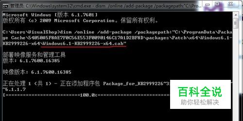 4、以管理员身份运行cmd ,输入下面的命令 dism /online /add-package /packagepath:"xxxxxxx\xxxxxx\Windows6.1-KB2999226-x64.cab(刚才解压的文件夹下面Windows6.1-KB2999226-x64.cab的位置)" 注意划红线部分别错了