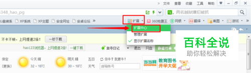 打开360安全浏览器,在收藏栏找到“扩展”,点击旁边的向下小三角,在下拉菜单中选择“扩展中心”;如图: