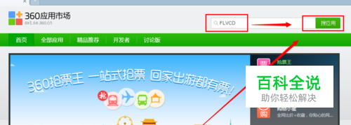 在打开的“360应用市场“中输入”FLVCD“,然后点击搜应用;如图: