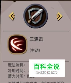 三连击: 这个是剑盾的主要输出技能,剑盾是一个需要操作的职业,不过这个技能确实傻瓜式操作,伤害还算可以。