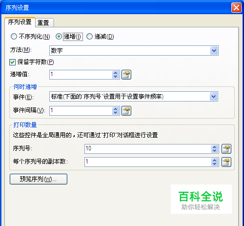 按需求选择“递增”序列或“递减”序列,此处以递增为例,方法选择为数字(当然,您也可以根据需求以字母或者其他选项为序列方法),勾选“保留字符数”,“序列号”设置为10(数字自定义,以需要为准);
