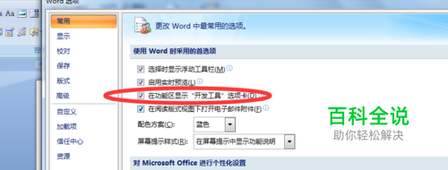 首先我们打开word文档,在功能区最上面可以找到一个开发工具选项,如果最上面没有的话,就找文件,word选项,在word选项对话框常用里有一个,在功能区显示开发工具选项卡,我们在前面勾选上就可以了。