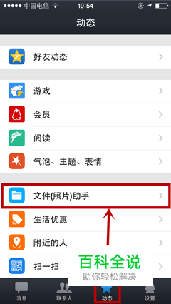 登录手机QQ,选中【动态】图标,再点击【文件(照片)助手】。