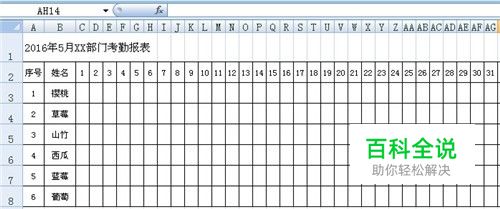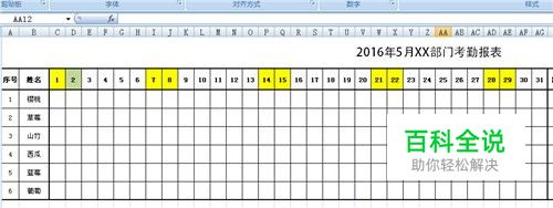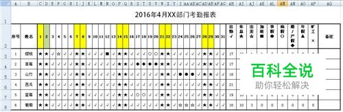 打开excel表格,分别输入考勤报表所需要内容: 表格标题:年月+公司/部门名称+考勤报表,如2016年4月某部门考勤报表; 表格基本信息:序号、员工姓名、日期(月份不同,日期差异1~2天); 考勤考核项目:出勤、休息、出差、加班、事假、病假、婚假、产假、年假、旷工(每个考核项目均用一个符号作标识,以方便统计,考核数值的单位为天);