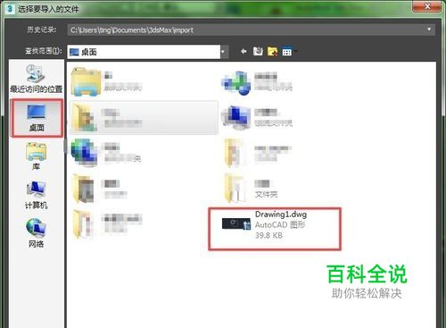 我需要导入的文件在桌面上,于是我选择了桌面。正好有一个CAD文件,点击它,点击“打开”。