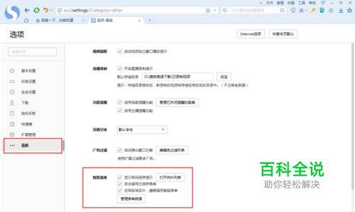 在左侧栏中点击”高级“,拖动下拉找到“智能填表”,勾选上“显示密码保存提示”和“自动填写已保存表单”两个选项