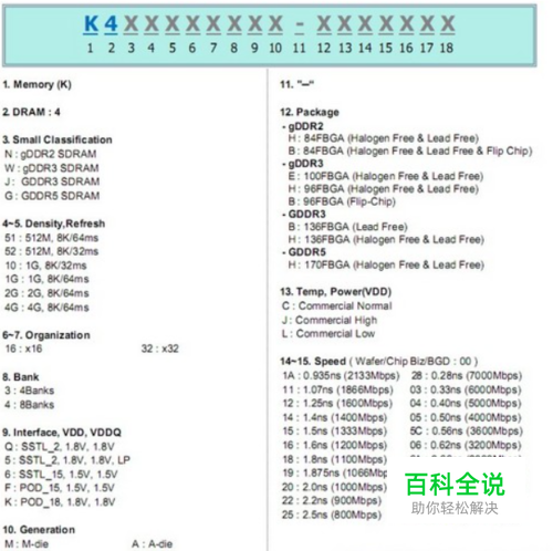 虽然显存颗粒上并没有直接的标出显存的容量,但我们可以从显存上编号的关键数字读出我们想要的信息。接下来,我们就针对目前市面上最常见的几种显存颗粒,给大家简要的介绍一下它们编号中的玄机。 下图就是三星(SAMSUNG)官方公布的显存规格定义表: