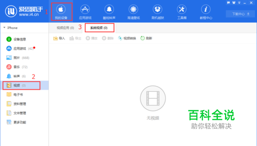 打开爱思助手PC端,将移动设备连接到电脑,点“我的设备-视频-系统视频”进入视频界面;
