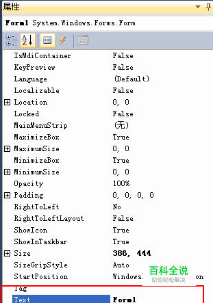 点击程序的外框,在Form1的属性框中找到【Text】,这时text的属性就是form1.