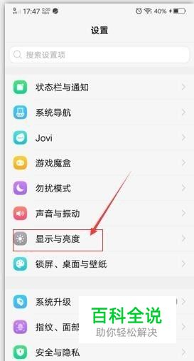 在“设置“界面找到”显示与亮度“菜单,点击打开。如果找不到”显示于亮度“请上下滑动屏幕找。