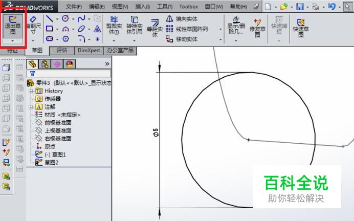 如下图所示, 以圆弧与直线的交点为圆心, 画一个直径5的圆, 用“智能尺寸”进行标注, 最后“退出草图”, 至此, 完成第二个草图的绘制。